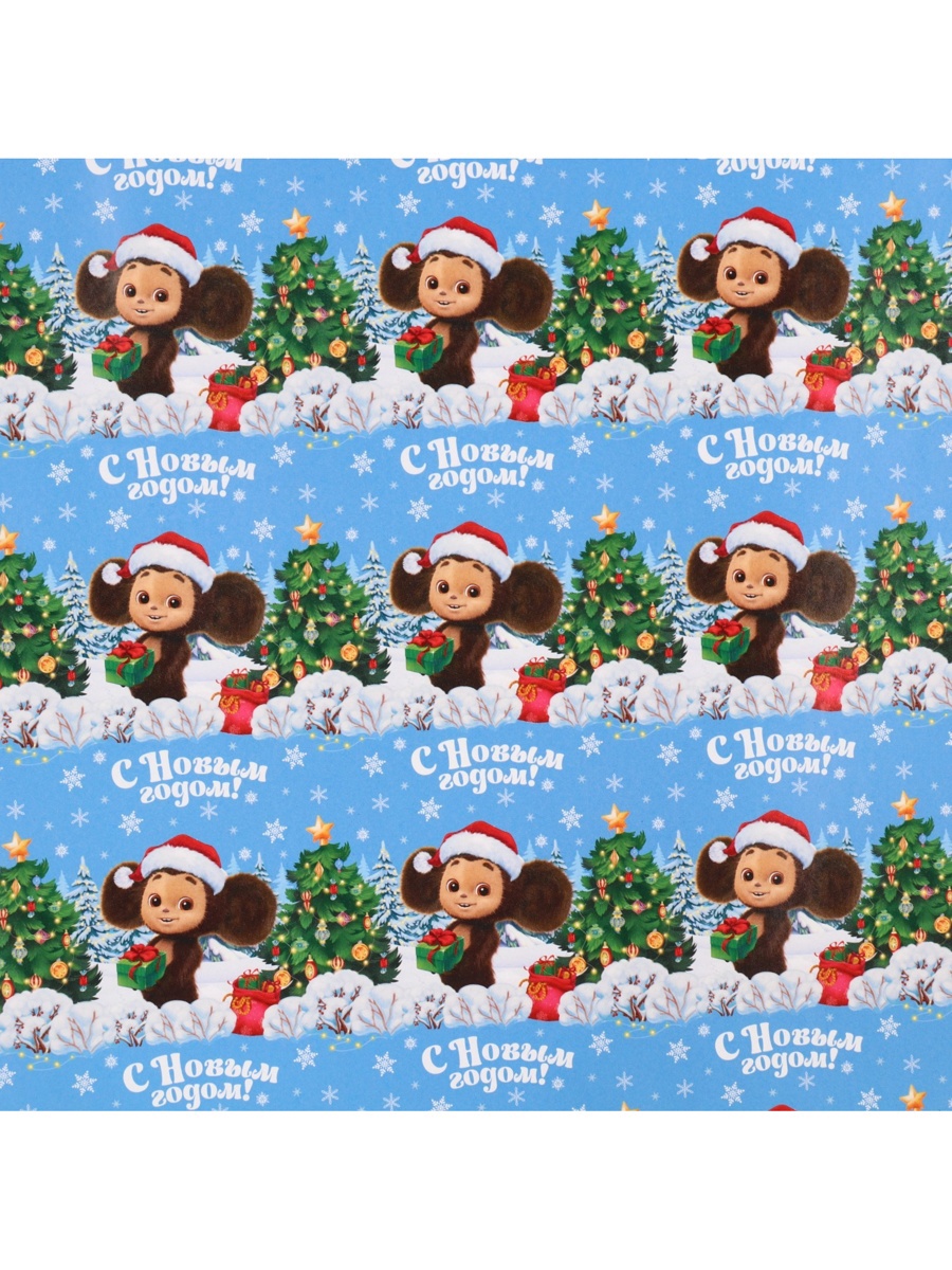 Бумага упаковочная для подарка "С Новым годом", Чебурашка, ёлка, 1 лист 70см*100см Голубой