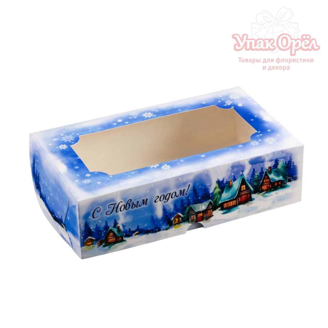 Коробка складная с окном «С Новым годом!», заснеженные домики, 25*15*7см, Голубой
