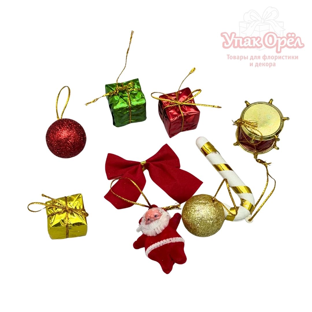 НГ Декор 2 подарка, 2 колокольчика, 2 шара, дед мороз, леденец; 8 штук