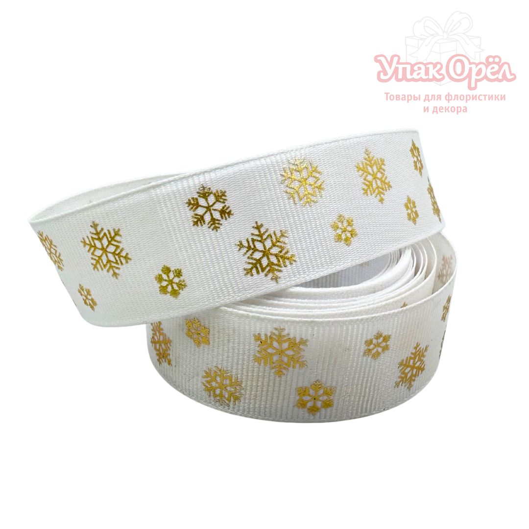 Лента с рисунком репсовая "Снежинки" 2,5см*3м, Золото/белый