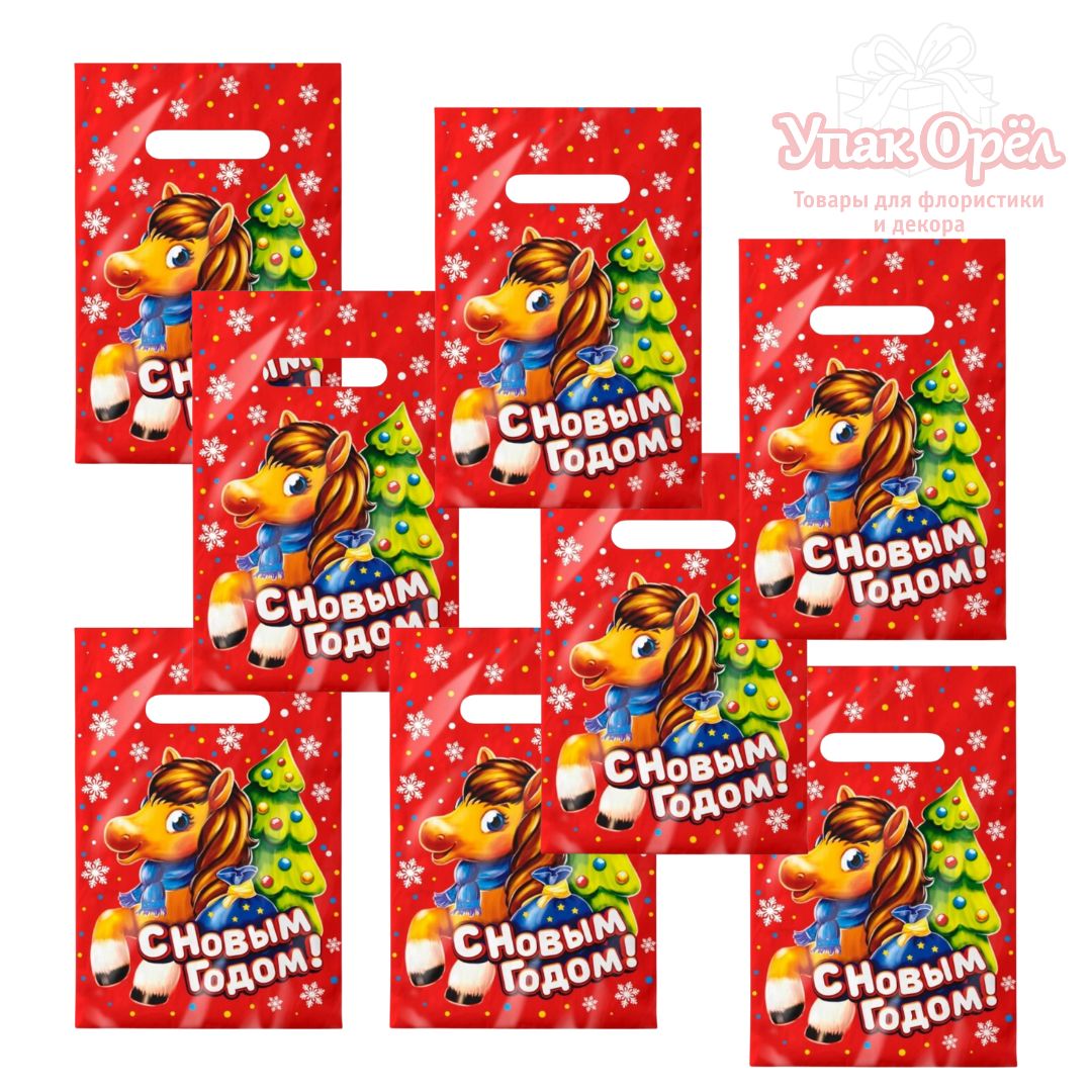 Актуальный дизайн — Яркое изображение лошадки на праздничном фоне делает пакет тематическим и современным подарком