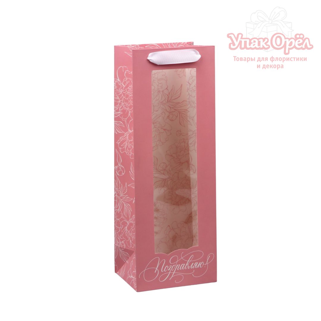 Пакет ламинированный под бутылку "Поздравляю", Розовый, 36*13*10см, 1 штука