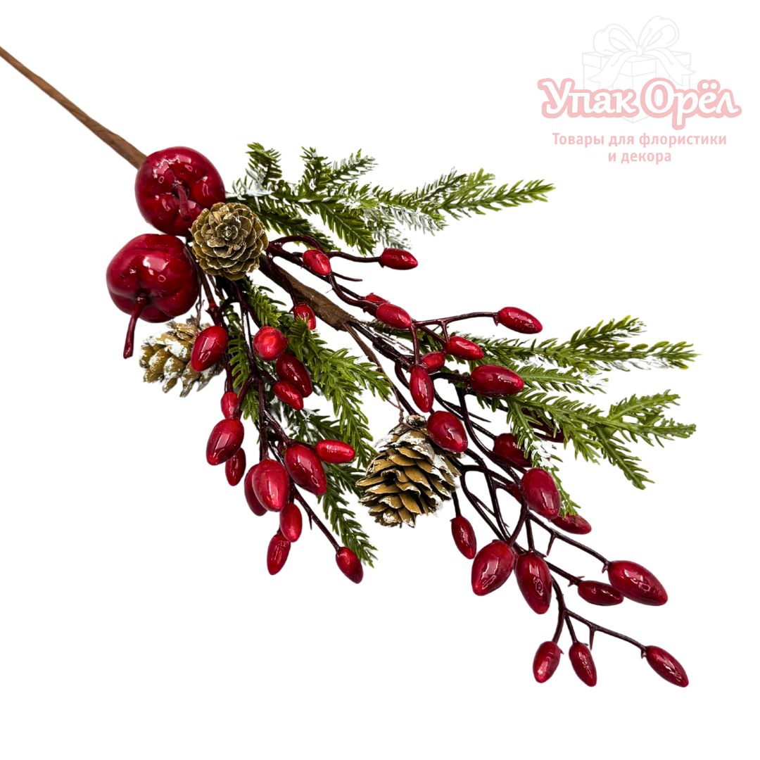 НГ Ветка с елкой, красными ягодами и яблоками, 42 см