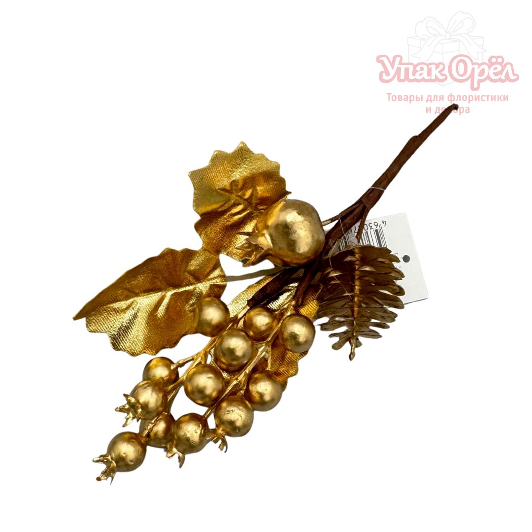НГ Ветка с ягодами, листьями и шишкой, 23см, Золото